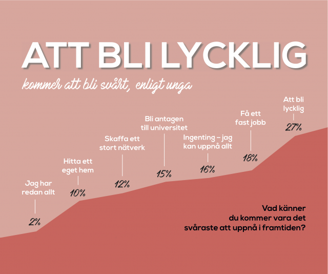 Trots att nyheterna rapporterar om både arbets- och bostadsbrist så är det inte jobb och bostad som Sveriges unga tror är svårast att uppnå i framtiden. Oavsett ålder och kön så uppger flest att det som kommer att bli svårast att uppnå i framtiden är att bli lycklig. Att få ett fast jobb samt ”jag tror inte att något är svårt att uppnå” kommer på andra respektive tredje plats. Egen bostad kommer först på sjätte plats.